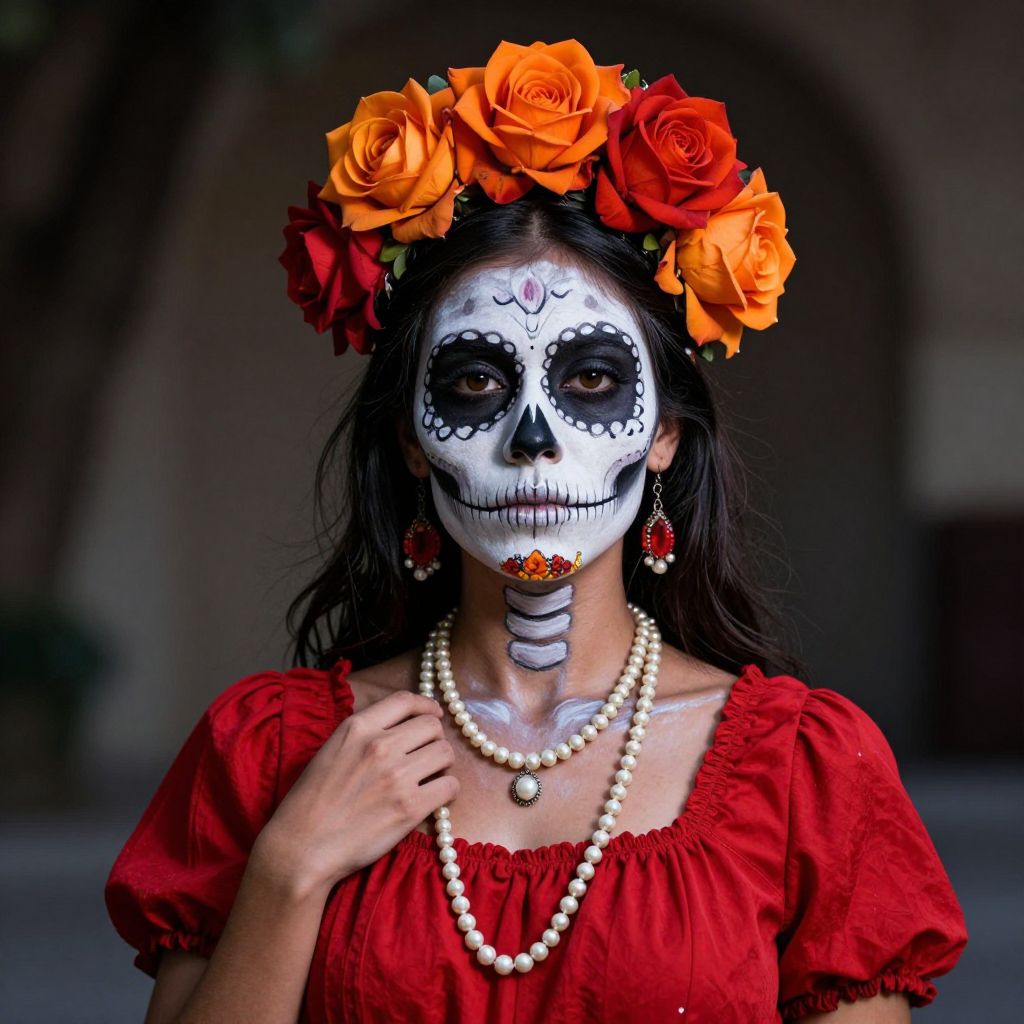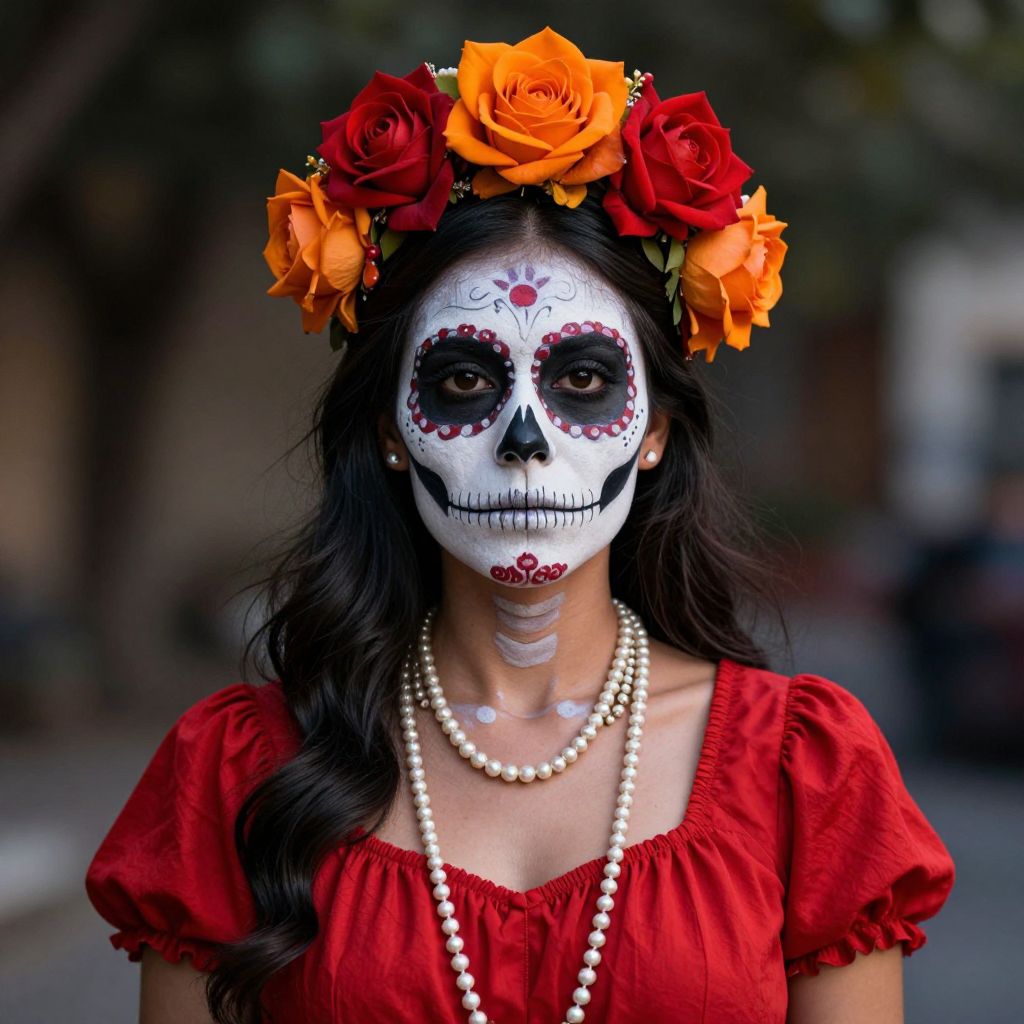 Skull-Painted Woman with Floral Crown