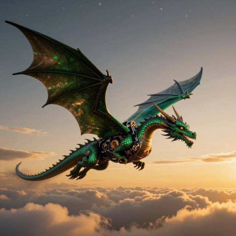 Silent flight of an ancient clockwork dragon, its emerald scales gleaming under the twilight sky, wings spread wide as it soars above a horizon bathed in golden clouds and studded with stars, its mechanical form adorned with intricate gears and glowing with the warmth of hope.