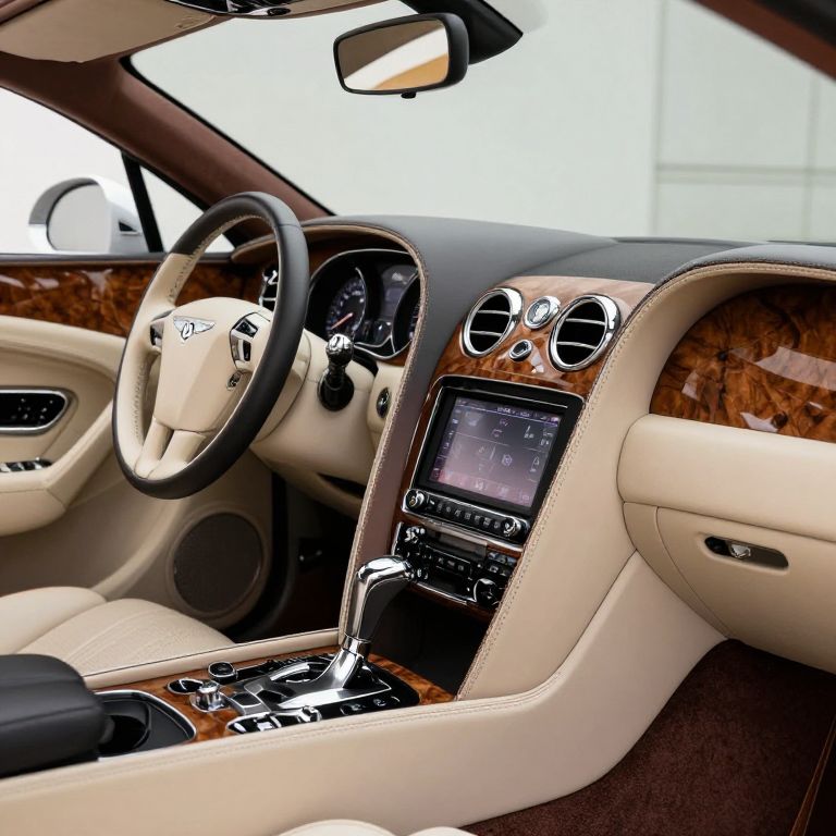 Luxurious interior of a 2014 Bentley Continental GT Speed Convertible showcasing a cream leather dashboard, polished wood accents, a central touchscreen display, and a sleek gear shift console, all reflecting the refined craftsmanship typical of high-end luxury vehicles.