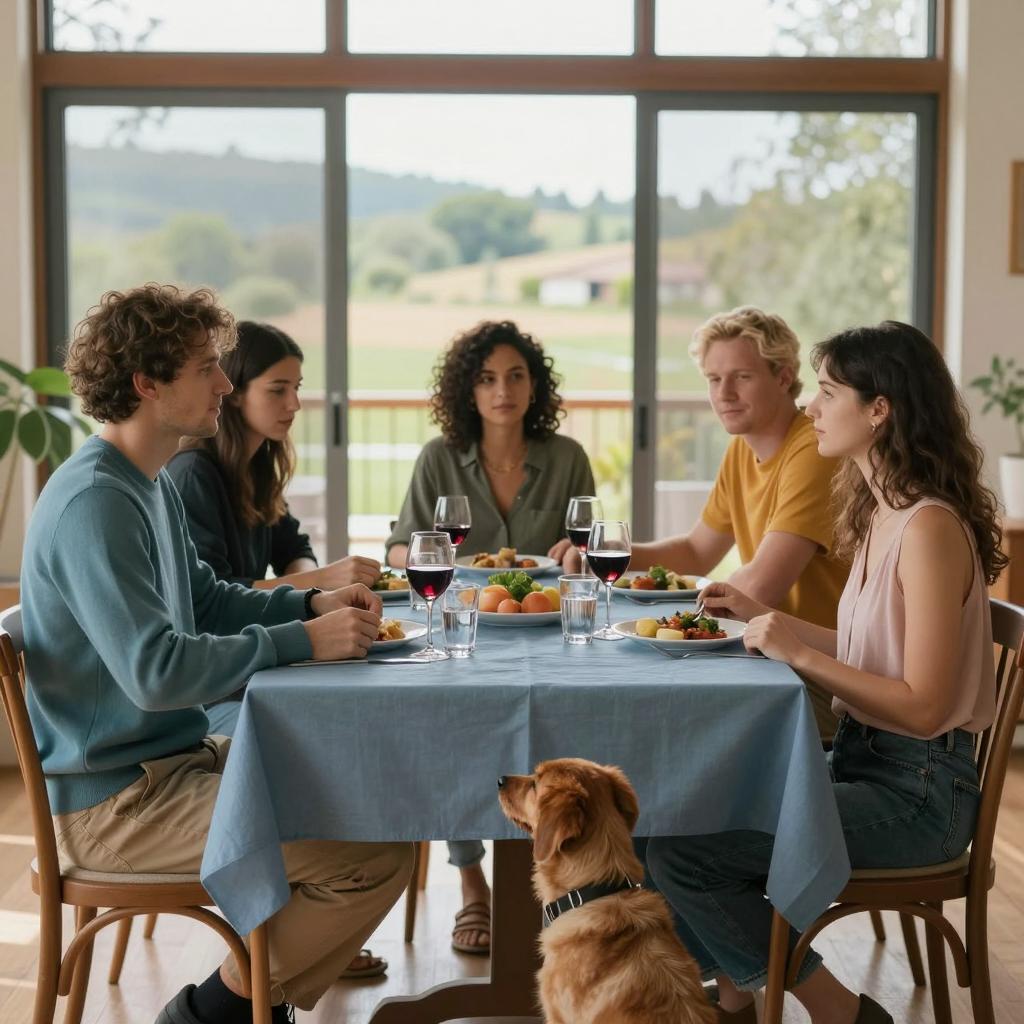 Four people sit around a dining table eating. Man on left in green shirt, man in center in white shirt, elderly woman in blue blouse, man on right in white shirt. Table has food, glasses, bread, and a vase of grapes. Clock on floral wallpaper background. Elderly woman looks at others, others look at her.