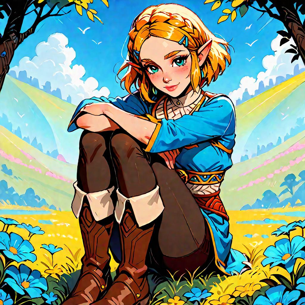 Digital illustration of Zelda from The Legend of Zelda, with blonde hair, blue eyes, elf ears, and Hylian outfit, set against a colorful circular