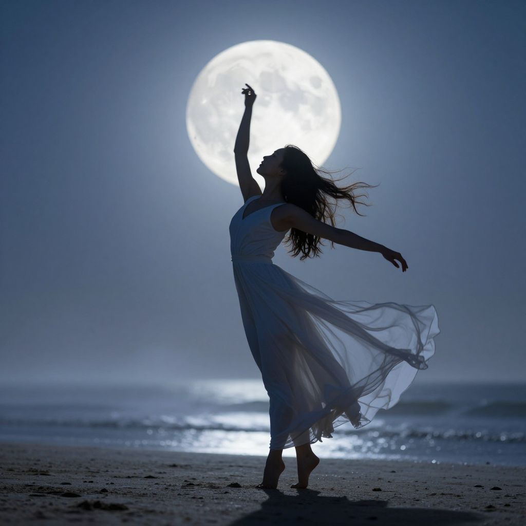 Silhouetted woman in flowing dress dances under full moon, ocean waves behind; blue, ethereal night scene, photograph.