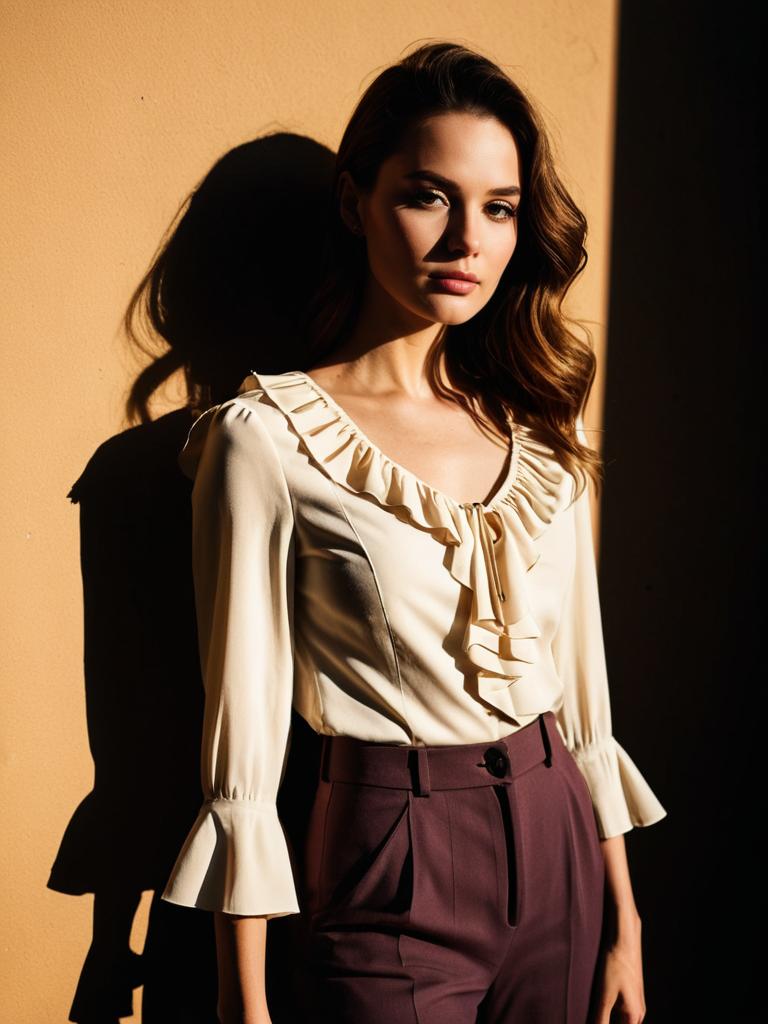 Woman, contemporary chic, cream sleeveless blouse with subtle ruffles, long fitted sleeves, scoop neckline, high waist mauve wide-leg trousers, studio background --sref 1393