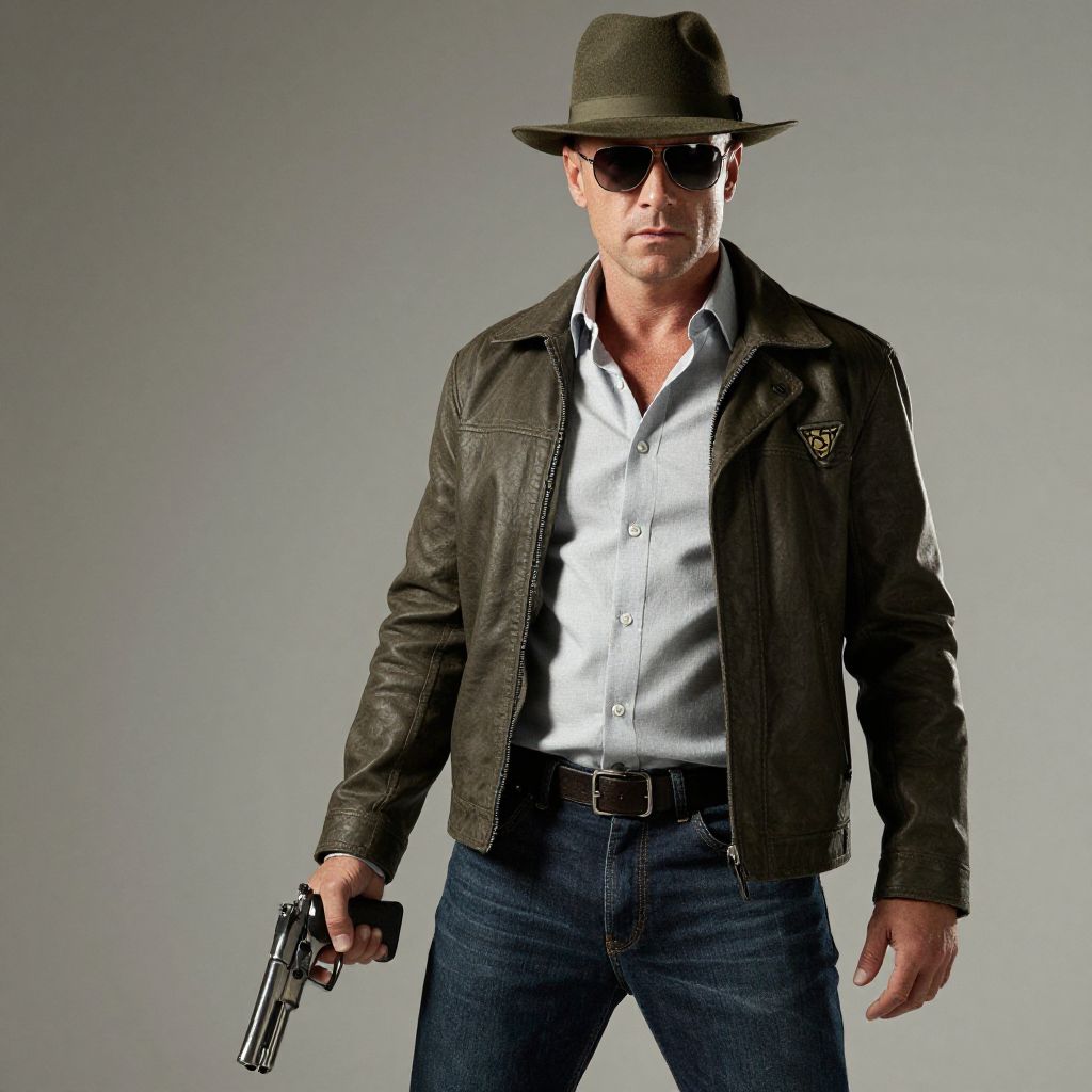 Man wearing a hat, sunglasses, a jacket, a shirt, and a pair of jeans. He is holding a gun in his right hand.