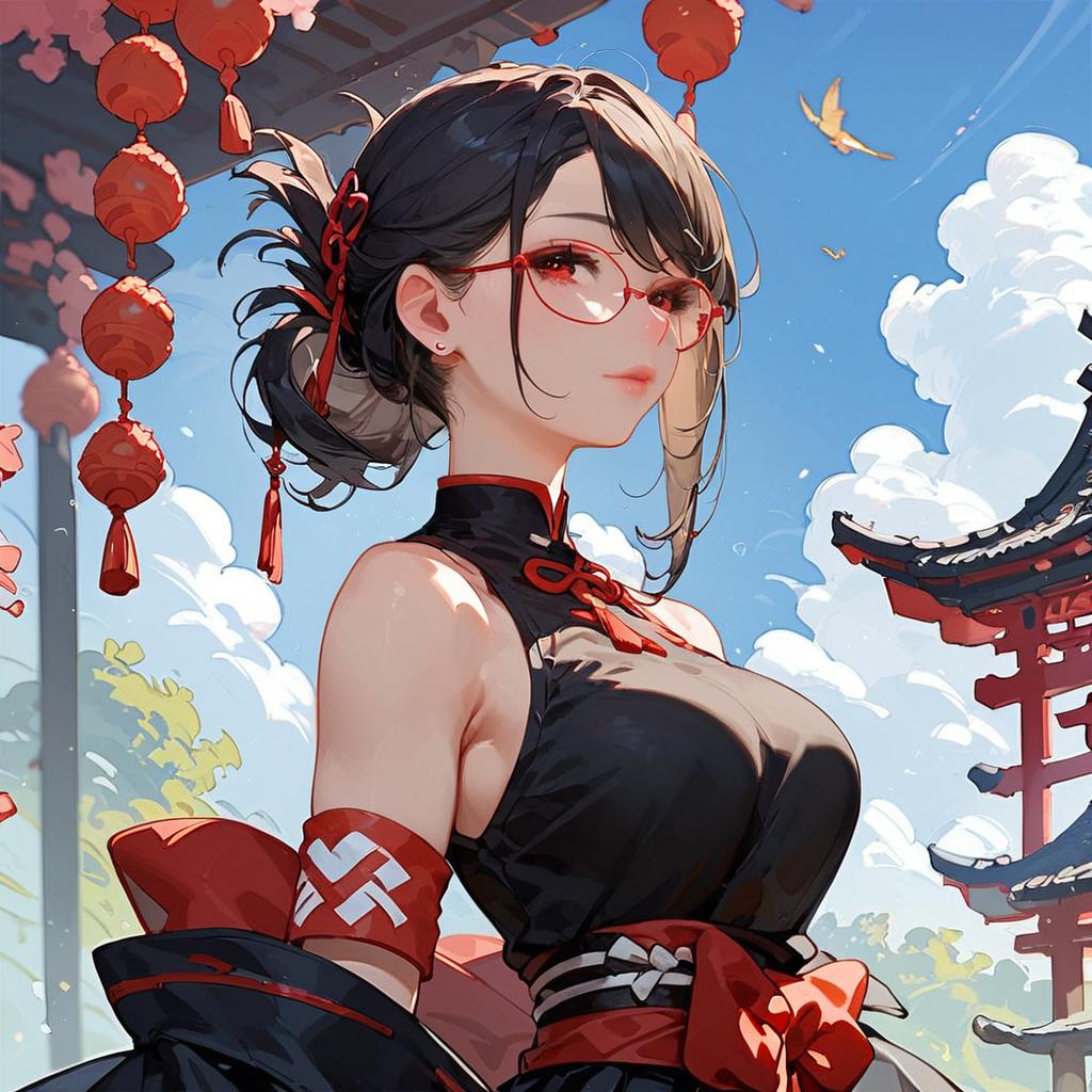 1girl, solo, cowboy shot, large breasts, japan, (sunlight:1.1), (sky:1.1), (outdoors:1.1), smile, open mouth, enno_chiaki, purple eyes, black hair, (twintails:1.4), hair bobbles, japanese clothes, white kimono, white skirt, score_9, score_8_up, score_7_up, source_anime, best quality, masterpiece, uncensored