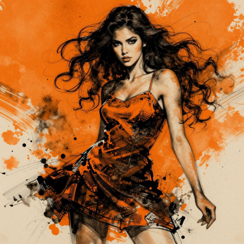 The image is a striking piece of art that combines elements of traditional and futuristic styles. A woman with long, wavy hair is depicted in a dynamic, expressive pose, her face turned slightly to the side, exuding a sense of confidence and mystery. She is wearing a mini dress that appears to be made of a textured fabric, adding depth and dimension to the image. The background is a vibrant mix of orange and black splashes, creating a sense of movement and energy. The use of ink and brushstrokes is evident, with the artist employing experimental techniques to achieve a high-quality, glibatree-style effect. The composition is dynamic, with the woman positioned centrally, drawing the viewer's eye to her face and the intricate details of her dress. The overall scene is a blend of traditional and futuristic elements, with the woman's attire and the futuristic background creating a captivating contrast. The attention to detail in the textures and colors enhances the visual richness of the image, making it a visually engaging and thought-provoking piece of art.