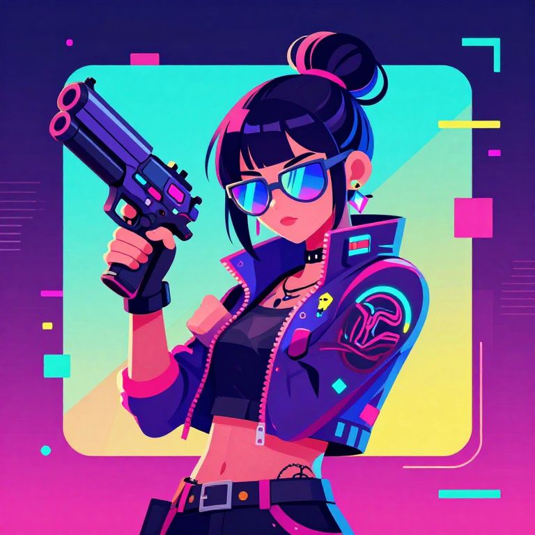 The image is a vibrant, vector poster in a cyberpunk style, featuring a girl with an anime aesthetic. She is depicted in a dynamic pose, holding a futuristic gun in her hand. The girl's hair is styled in a high bun, and she wears a pair of reflective sunglasses that add a cybernetic feel to her appearance. Her outfit is detailed with intricate designs and patterns, including a jacket with glowing elements and a tattoo-like design on her arm. The background is a mix of neon colors and geometric shapes, creating a sense of depth and movement. The overall composition is balanced, with the girl positioned centrally, and the elements around her arranged to enhance the cyberpunk theme. The use of neon colors and vector art style gives the image a futuristic and energetic atmosphere.