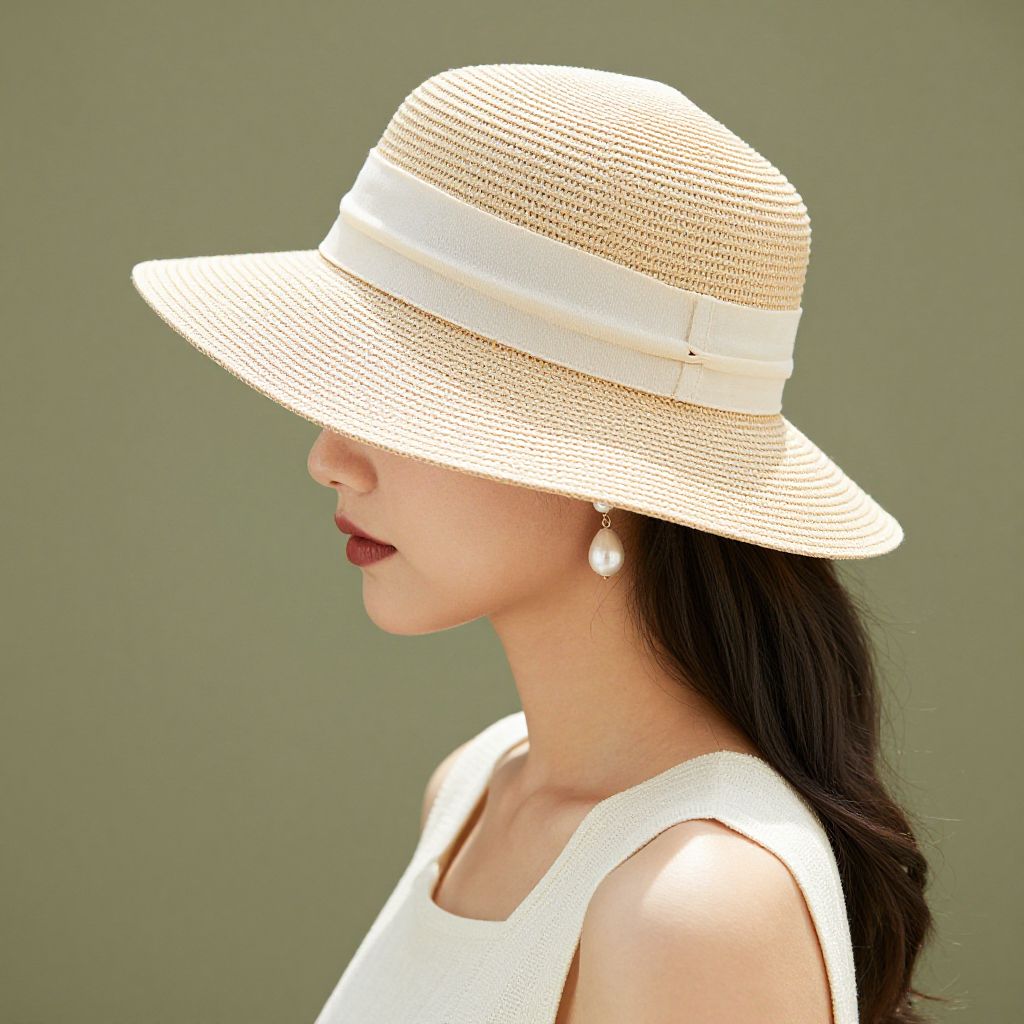 Woman modeling a wide-brimmed straw sun hat with a cream band, featuring a 22.5-inch circumference, paired with a delicate pearl earring and a matching sleeveless top.
