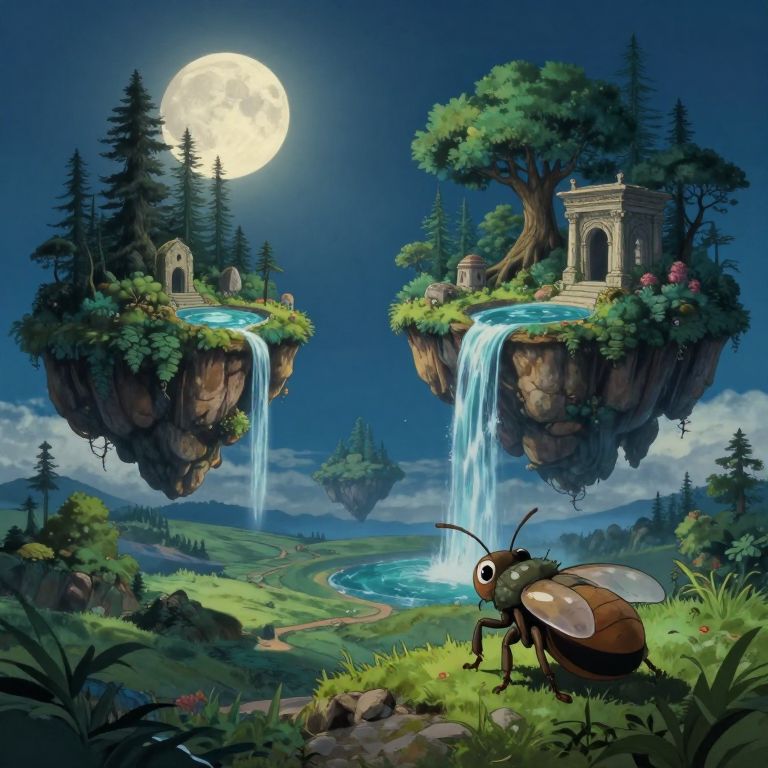 Envision an enchanting digital artwork that blends the whimsical essence of Studio Ghibli's ethereal style with the captivating surrealism reminiscent of Magritte. This mesmerizing piece depicts a celestial perspective from a curious insect, offering a breathtaking view of a tranquil landscape under the soft glow of moonlight. Floating islands in this dreamlike scene harmoniously house lush forests, cascading waterfalls that feed into crystal-clear pools, and ancient ruins, all bathed in ethereal lunar light that casts elongated shadows. This delicate interplay between reality and fantasy evokes a sense of wonder, mystery, and nostalgia as viewers immerse themselves in the captivating realm from an extraordinary vantage point.