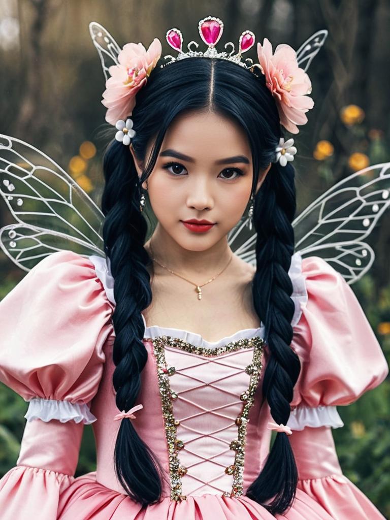 Tik tok fairy costume, 1girl, solo, flower, hair ornament, black hair, realistic, wings, blurry background, hair flower, dress, blurry, insect wings, jewelry, tiara, looking at viewer, crown, long sleeves, puffy sleeves, twintails, pink dress