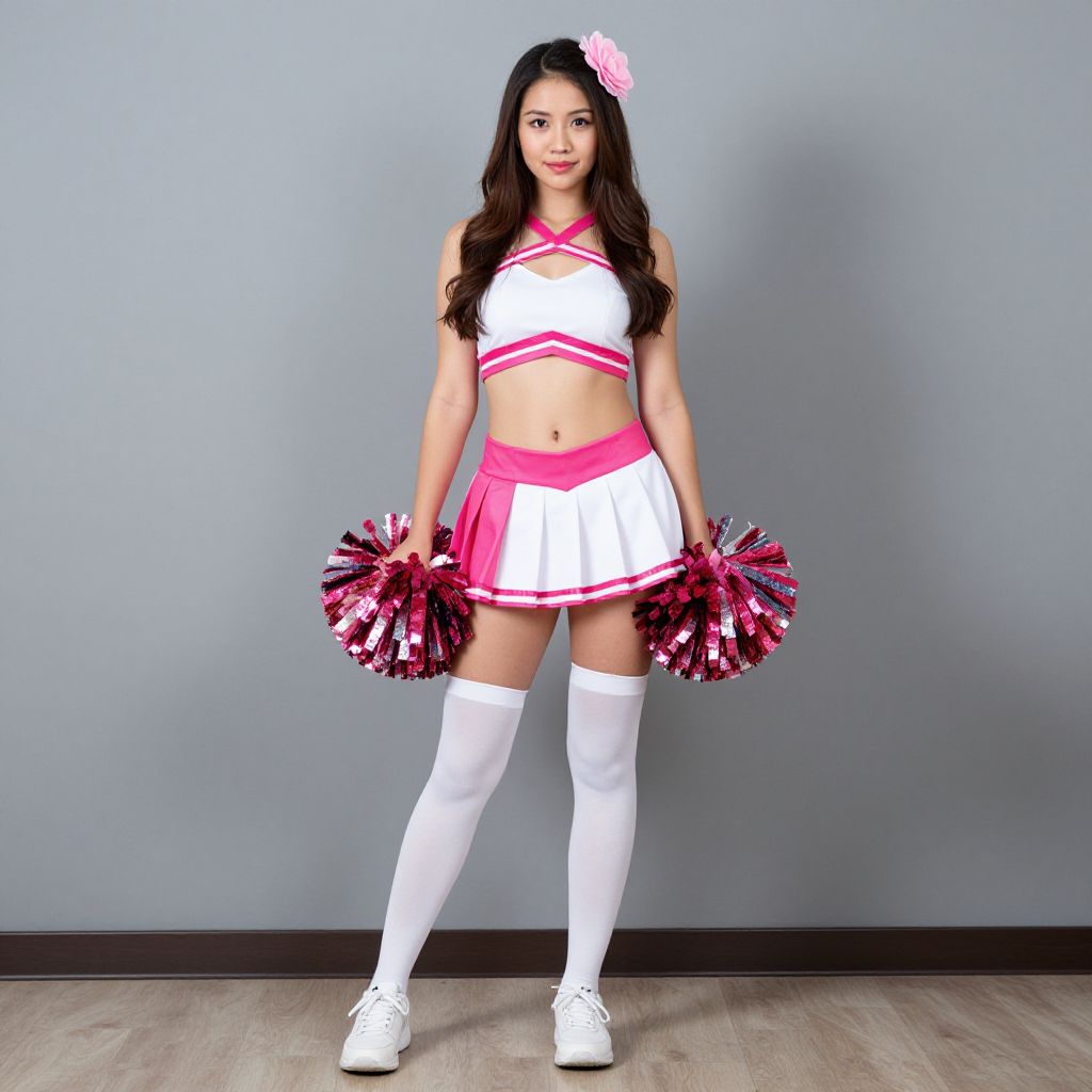 Photograph of an Asian woman with long black hair, wearing a white and pink cheerleader outfit, holding pink pom-poms, white thigh-high socks