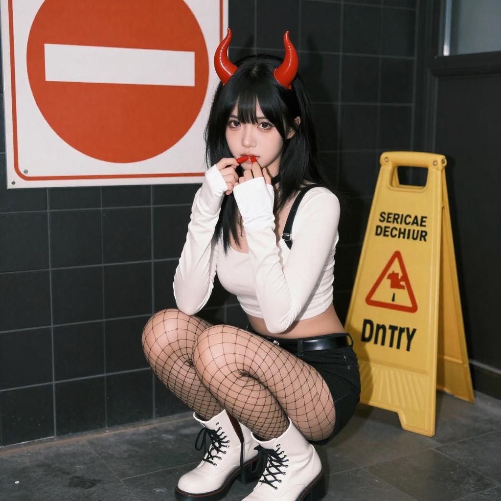 Photograph of a young woman with black hair and red horns, squatting in a dark, tiled room. She wears a white, long-sleeve crop top with black straps, black shorts, fishnet stockings, and white boots with red accents. Her hands are gloved, and she holds a red object near her mouth. A "No Entry" sign and a yellow caution sign are on the black tiled wall behind her.