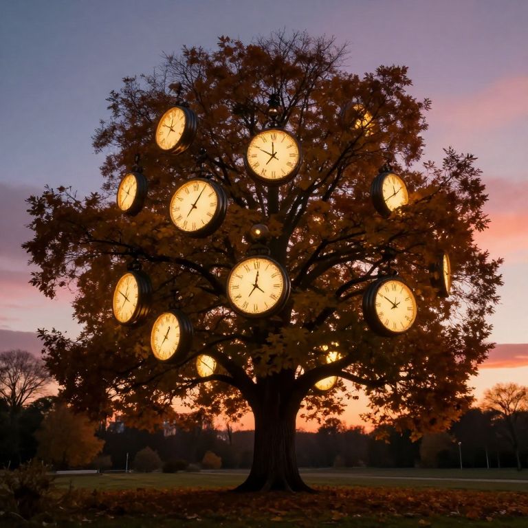 A surreal digital artwork depicts a tree adorned with glowing clocks, their illuminated faces casting a warm, ethereal light amidst autumnal foliage, symbolizing the cyclical nature of time as it intertwines with the natural world under a dreamlike, reversed sunset.