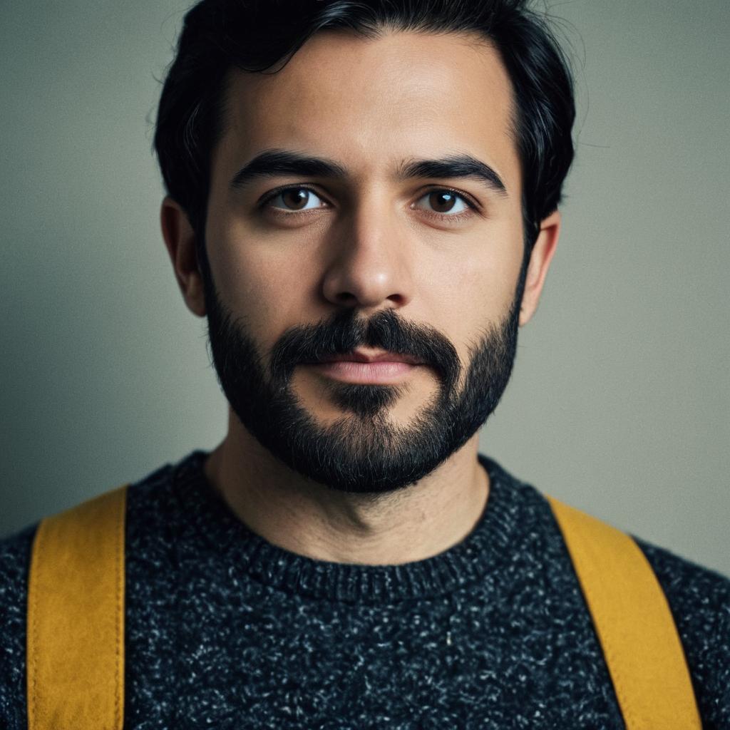 Close-up photorealistic portrait of a man with black hair, a full beard, and mustache. He has a medium skin tone and is wearing a dark gray textured sweater with mustard yellow suspenders. The man is looking directly at the camera with a neutral expression against a plain background.