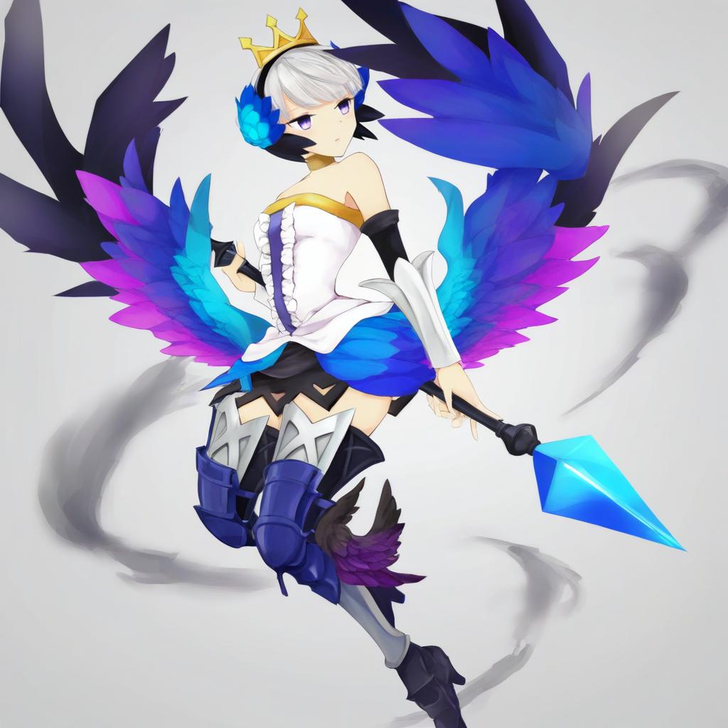 Gwendolyn (odin sphere), odin sphere, 1girl, blue eyes, purple eyes, white hair, short hair, grey hair, strapless dress, armored dress, thighhighs, bare shoulders, detached sleeves, choker, multicolored wings, low wings, multiple wings, spear, crown, by artist lasterk, animagine