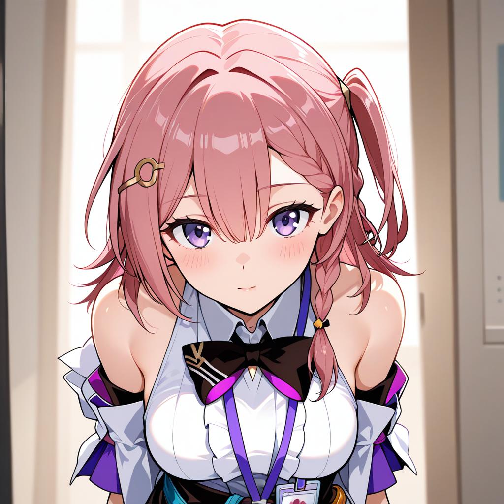 Asta (honkai: star rail), honkai: star rail, 1girl, blue eyes, hair between eyes, pink hair, medium hair, long hair, braid, hair ornament, hairclip, medium breasts, white shirt, sleeveless shirt, bare shoulders, detached sleeves, one side up, id card, by artist trefle r, illustrious