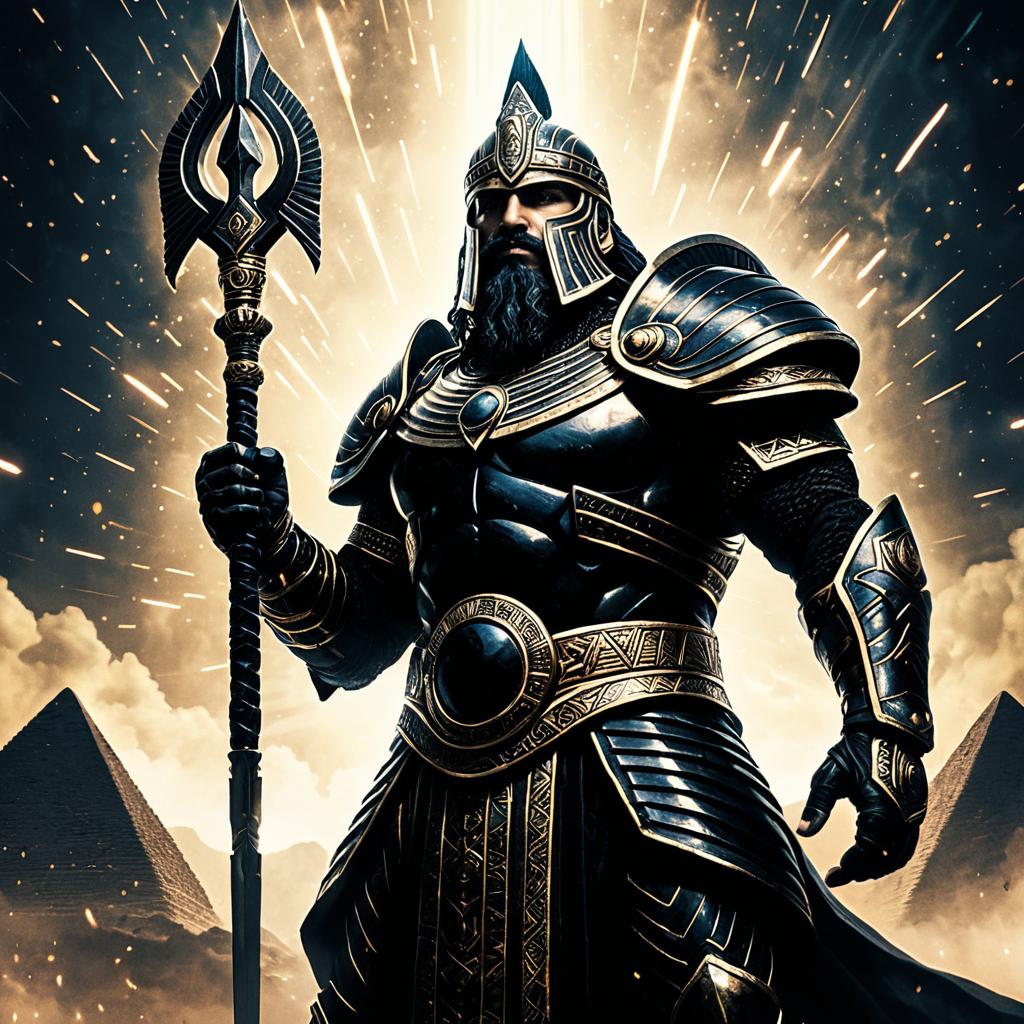 Anu – Sky father and supreme god of Mesopotamia, radiating power and clad in streamlined onyx battle armor, surrounded by glowing divine energy in a dramatic fantasy illustration