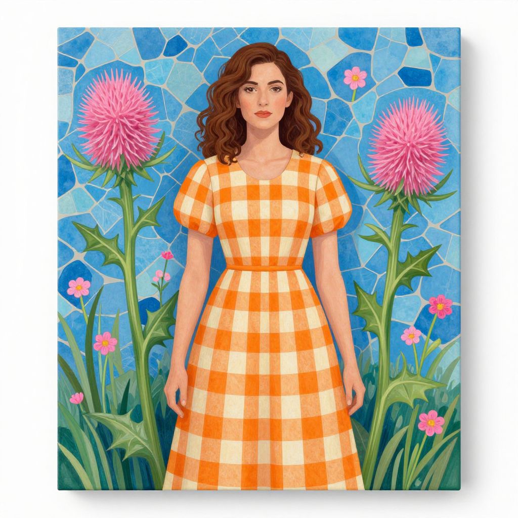Digital illustration of a curly-haired woman in an orange-check dress, standing among pink thistles and blue mosaic-tiled background.