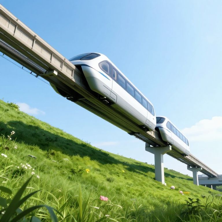 Alien incredibly realistic photo of a futuristic monorail travelling along the side of a grassy hill on a sunny day,