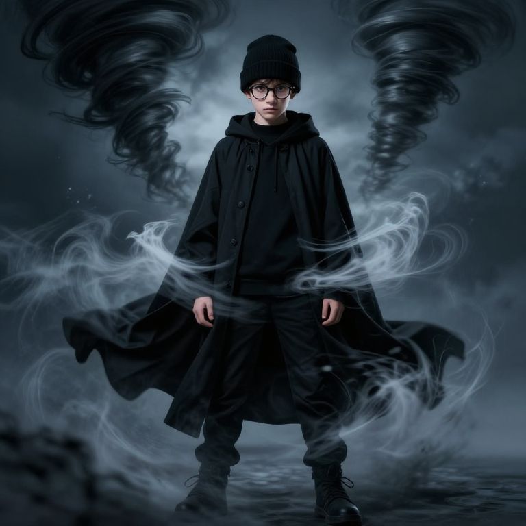Photograph of a young boy in a black hooded cloak, glasses, and beanie, surrounded by swirling dark and blue smoke.