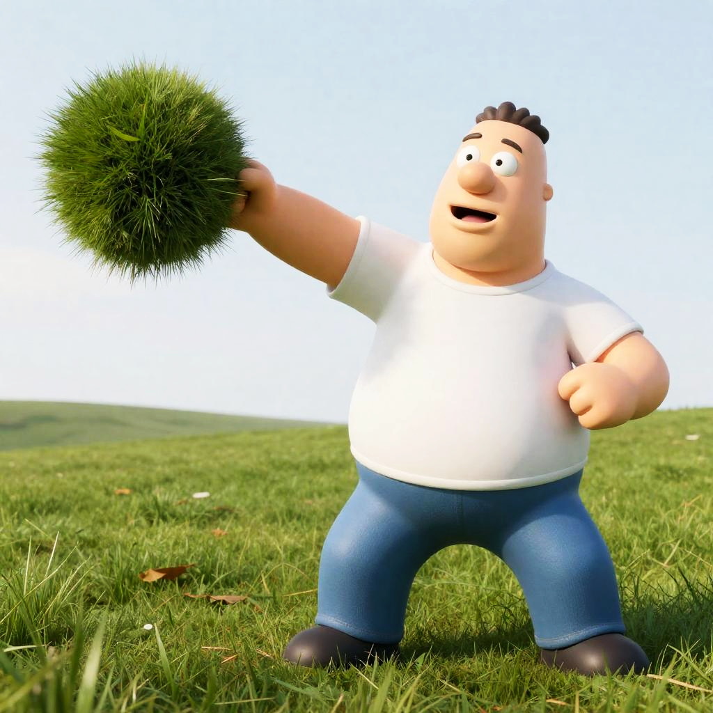 A CGI cartoon image of a chubby, fair-skinned man with black hair, wearing a white t-shirt and blue jeans, standing in a grassy field under a bright blue sky with fluffy white clouds. He holds a large, green, spiky grass ball in his right hand, raised above his head. His left hand is clenched at his side. The grassy field has scattered leaves and small patches of dirt. The man has a content expression with slightly raised eyebrows. The background features a blurred, expansive field with distant trees. The style is colorful and 3D animated.