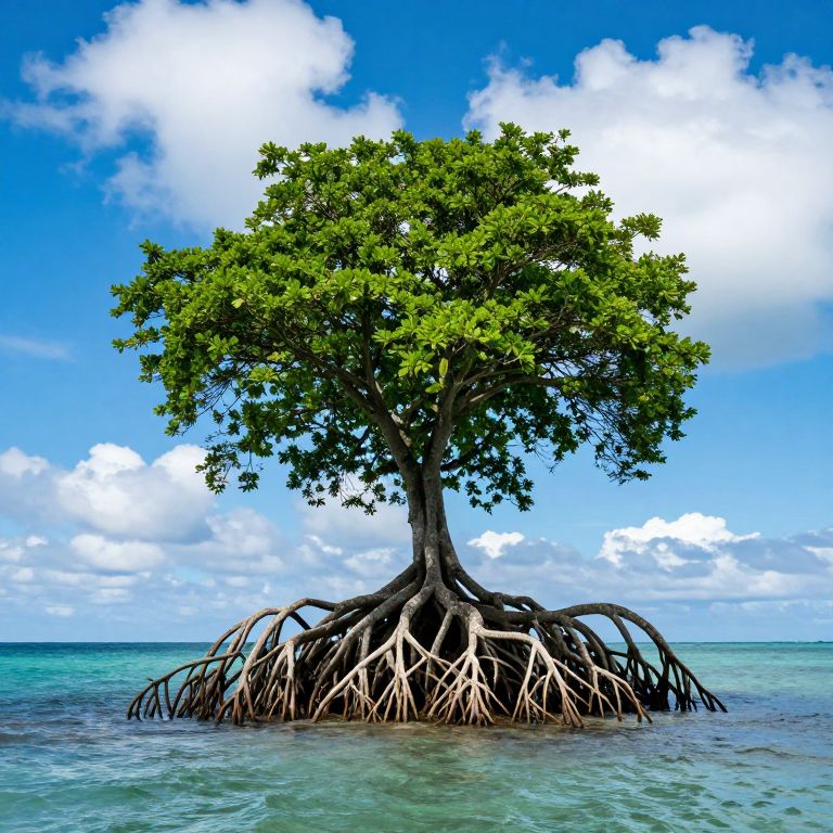Solitary tree stands resiliently atop a small island, its lush green canopy reaching toward the vibrant blue sky dotted with fluffy white clouds, while its intricate network of roots extends deep into the tranquil ocean waters below.