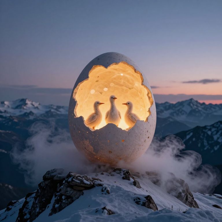 Glowing Eggshell with Surreal Birds on Snowy Mountain Peak