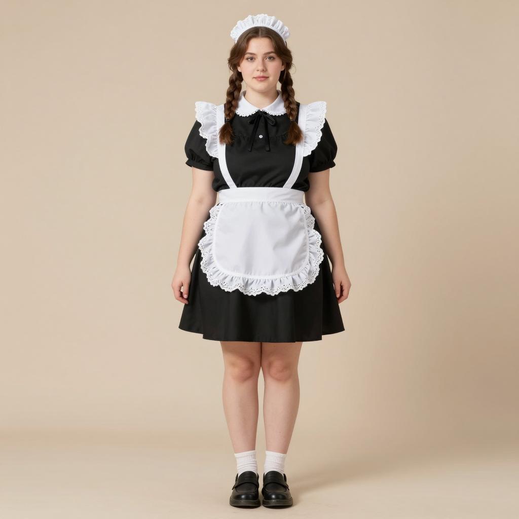 Adult french maid costume, photograph of a young woman in a French maid outfit, standing in a vintage kitchen, wearing a black dress with white lace trim, white puffed sleeves, black bow tie, white headband, black shoes, white socks, wooden shelves with pottery, brown wooden cabinets, realistic lighting, realistic ures, daytime, neutral background, standing pose, smiling, red hair, Caucasian, average build, cute, detailed outfit, cozy atmosphere