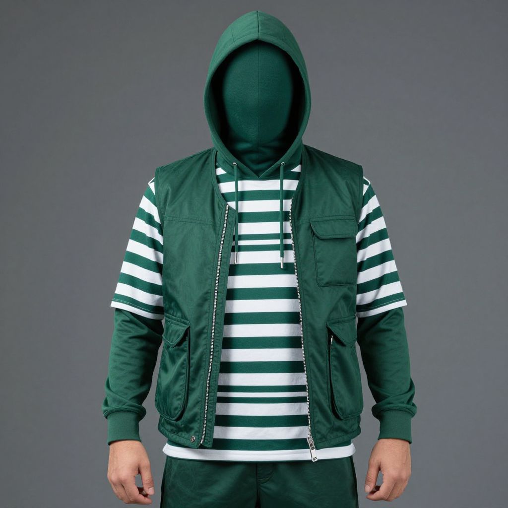 Rogue Green Costume, man in green vest and striped shirt with a green hoodie