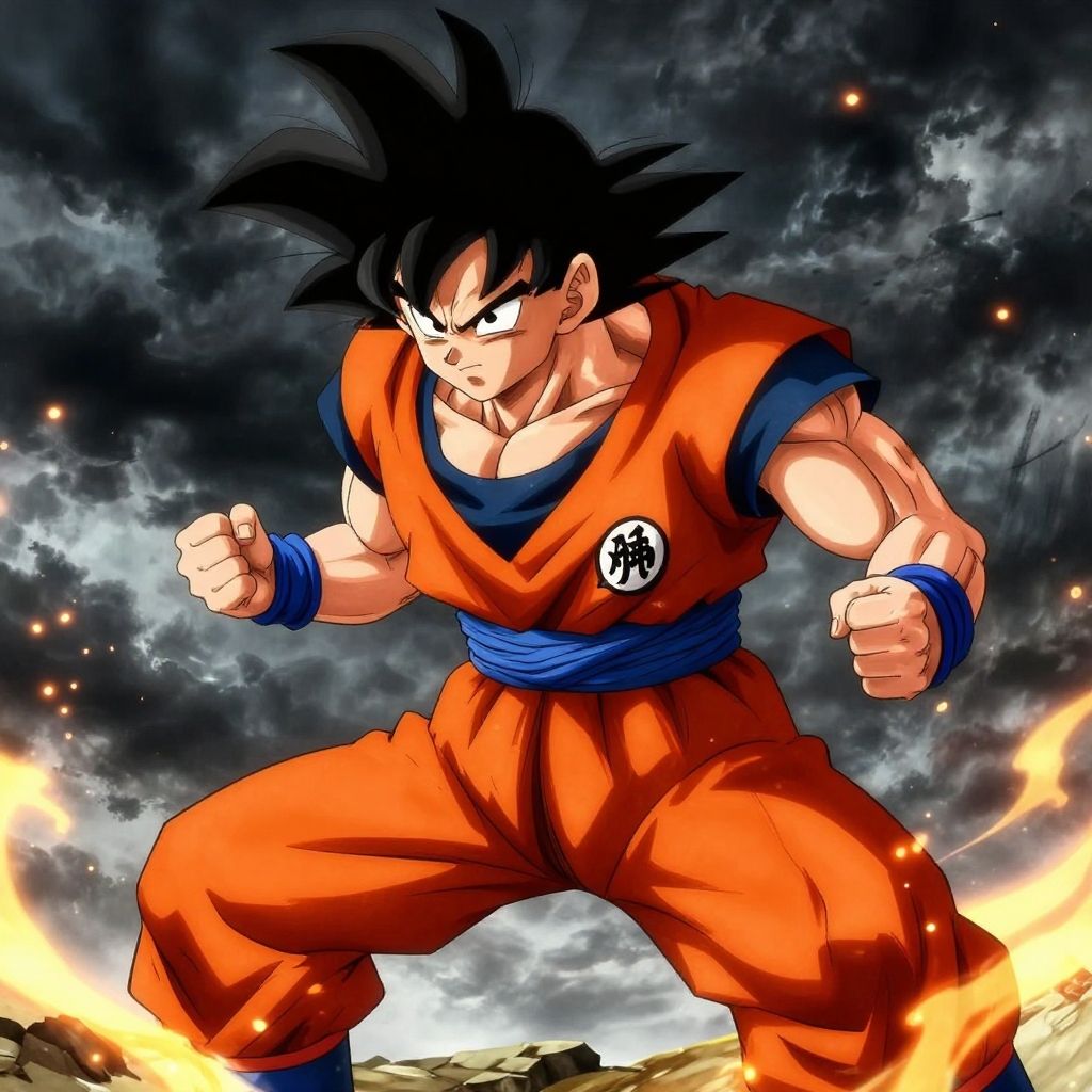 Goku looking down determined, ready for battle, sparks flying around him, torn orange gi fluttering, dark stormy clouds overhead, cinematic anime illustration with sharp lines and dynamic pose