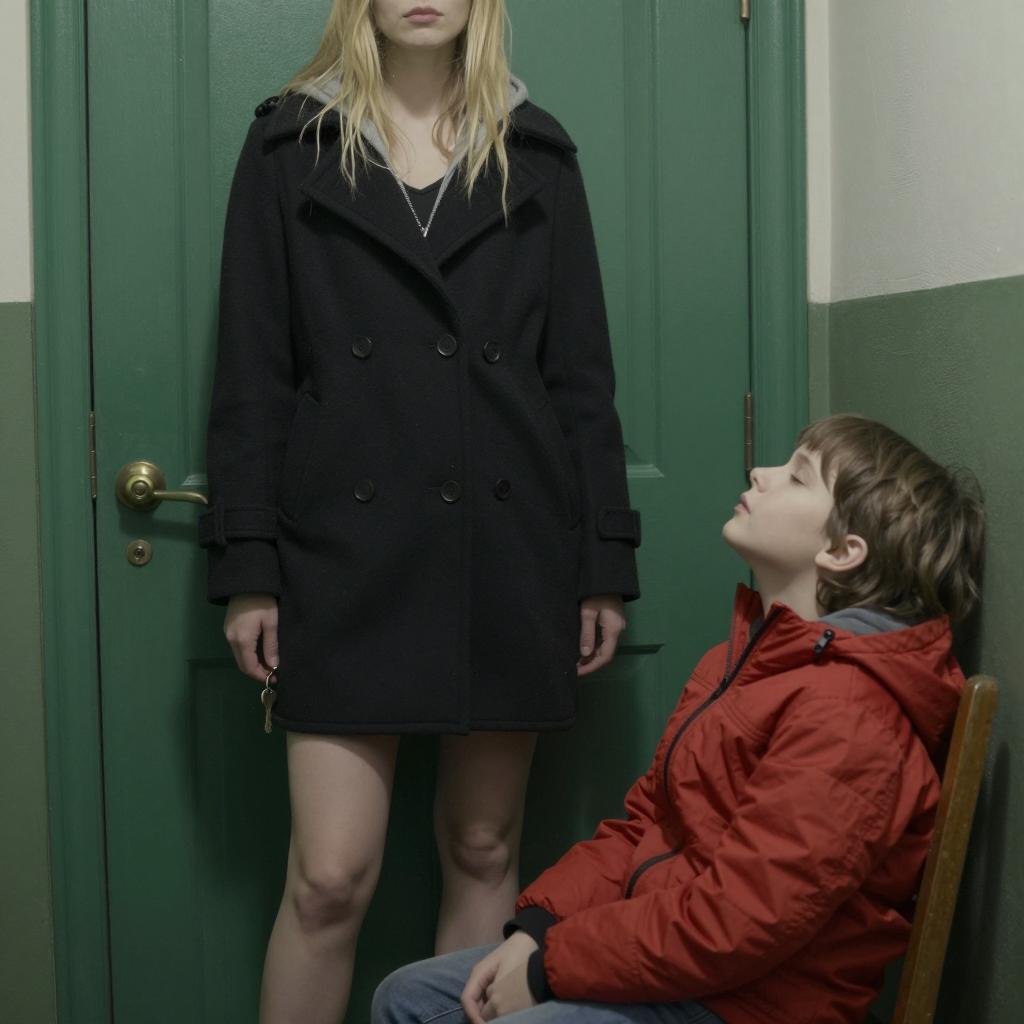 Woman with blonde hair in black coat, standing in dimly lit green hallway, visible thigh, holding key. Child in red jacket, sitting in wooden chair, head tilted back, eyes closed. Green door in background, brass doorknob on left.