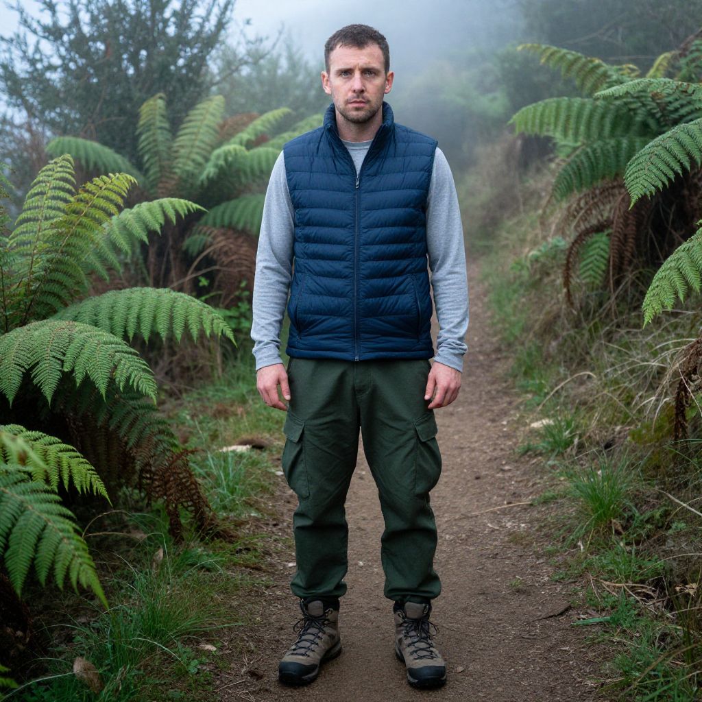 A man, layered long-sleeve base layer, dark navy blue, lightweight insulated vest, cargo joggers, deep forest green, rugged hiking boots, misty morning, vibrant ferns, winding dirt path, disposable camera style, contemplative expression.Man has masculine face and piercing eyes