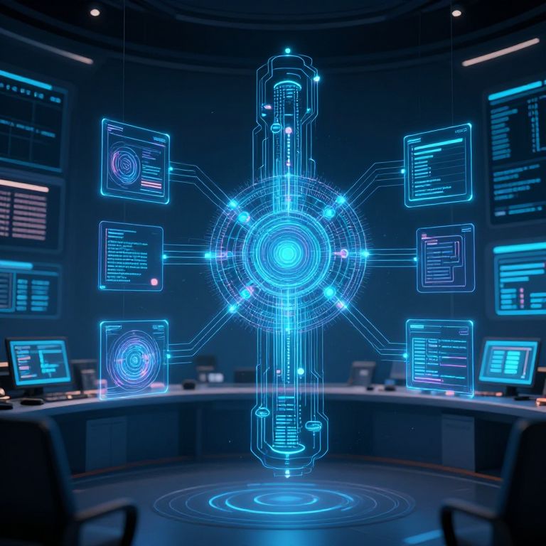 This is a digital CGI image of a futuristic control room with a dark blue, circular backdrop. Central to the image is a glowing, neon-blue holographic interface resembling a concentric circle with interconnected nodes and text boxes floating around it. Eight illuminated text boxes, each containing lines of code, are evenly spaced around the central hologram. The control room features multiple dark blue, illuminated computer screens on a curved console in the foreground and background, displaying various lines of text and data. The overall scene emits a high-tech, sci-fi ambiance with a focus on digital connectivity and advanced technology.