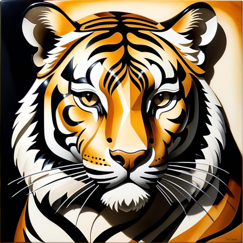 Stylized portrait of a tiger created in an Art Deco style, featuring onyx and jet black color tones. The image showcases geometric patterns and sharp contrasts inspired by Tamara de Lempicka and Erté's art, highlighting the tiger's striking orange, white, and black stripes with a detailed and elegant finish.