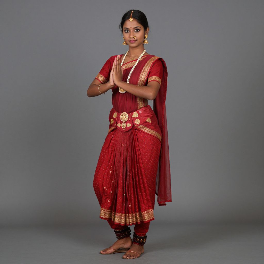 Photograph of a South Asian woman standing against a plain gray background. She has a medium brown skin tone, black hair tied in a neat bun, and is wearing a traditional red saree with gold embroidery and circular gold embellishments on the waist. Her saree has a short-sleeved blouse and a matching red pallu draped over her shoulder. She is adorned with gold jhumka earrings, a nose ring, and a bindi. She is barefoot and standing with her hands in a prayer position at chest level. Her expression is calm and confident.