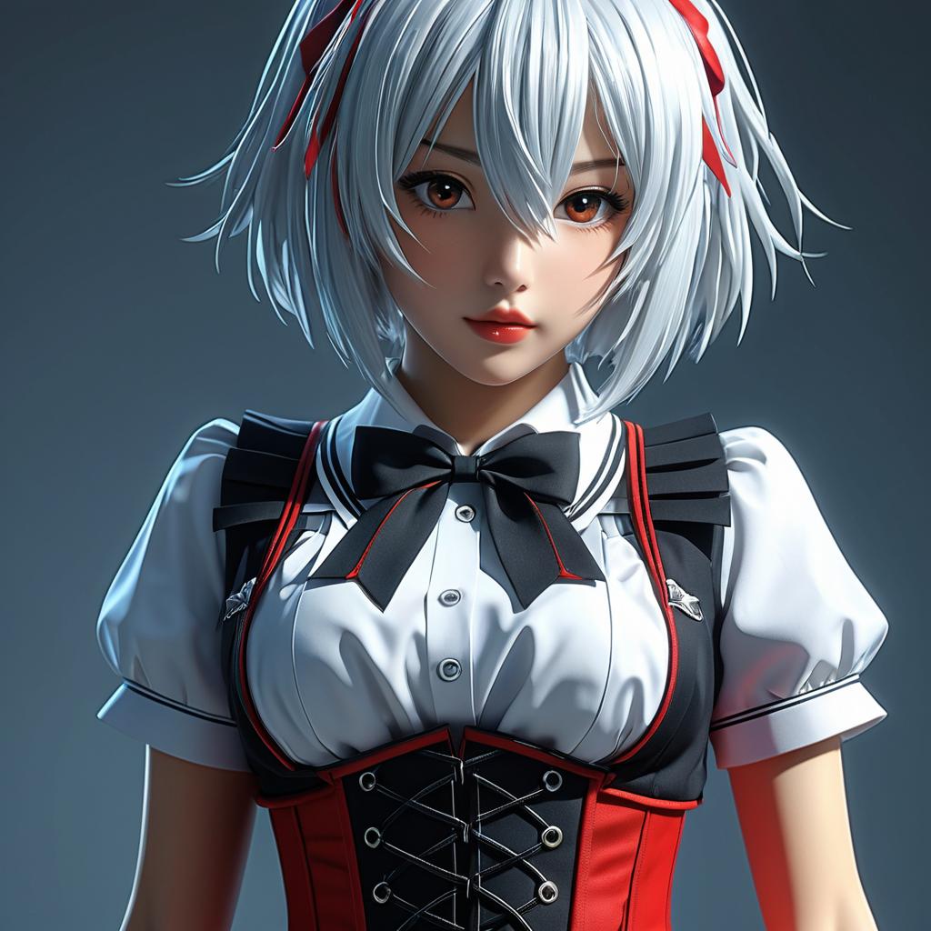 Koneko Toujou (DXD), 1girl, white hair, short hair, konekouniform, school uniform, white shirt, skirt, red skirt, black ribbon, black corset, clear image:1, (correct anatomy:1.2), (best quality:1.2), best illumination, (best shadow:1.1), highres, (ray tracing:1), reflected light, (high detail clothes:1.3), ((illustration:1.1)), ((masterpiece)), (((best quality))), ((beautiful detailed eyes)), (extremely detailed CG unity 8k wallpaper:1), ((ultra-detailed:1)), colorful, wallpaper, (perfect artwork:1), (beautiful face:1), pure face, Detailed background, (detailed hands, five fingers), beautiful facial features