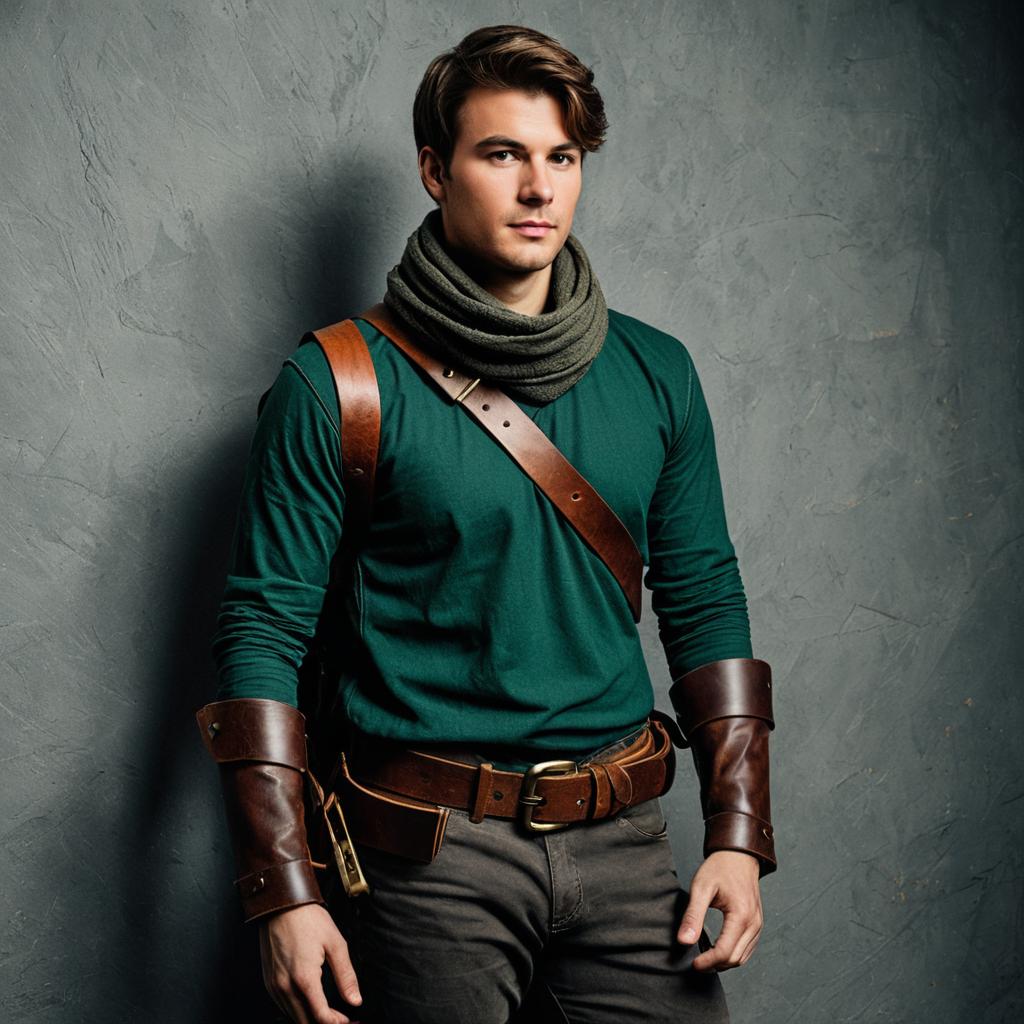 Roleplay outfit, photo of handsome young man, standing against ured gray wall, wearing green long-sleeve shirt, brown leather crossbody strap, dark gray pants, brown leather belt with intricate buckle, gray scarf, bronze bracers on forearms, short brown hair, serious expression, realistic lighting, medieval fantasy style, cinematic, high detail, medium shot, slight shadows, natural colors, rugged and adventurous outfit