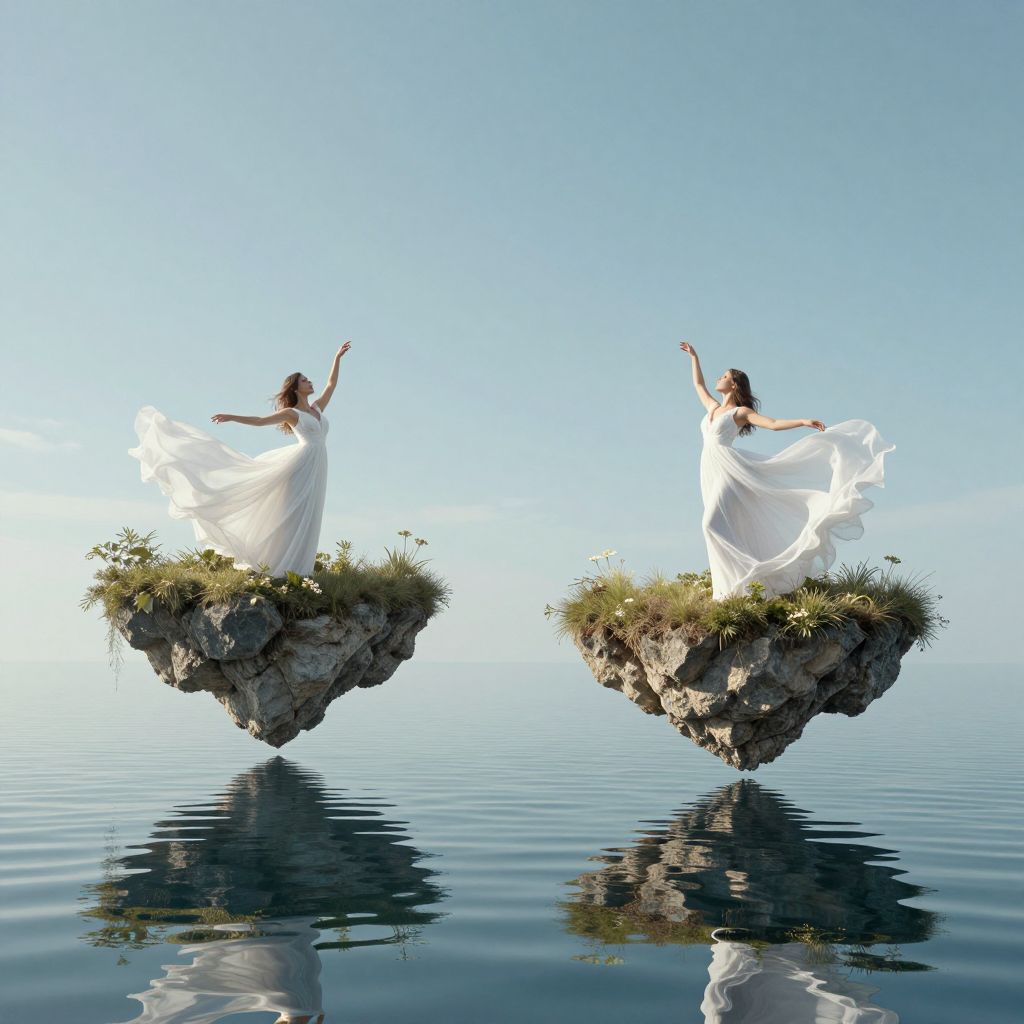 Two ethereal islands float serenely above a tranquil water mirror, each cradling a woman in flowing white gowns, defying gravity and reality in a dreamlike dance between earth and sky.