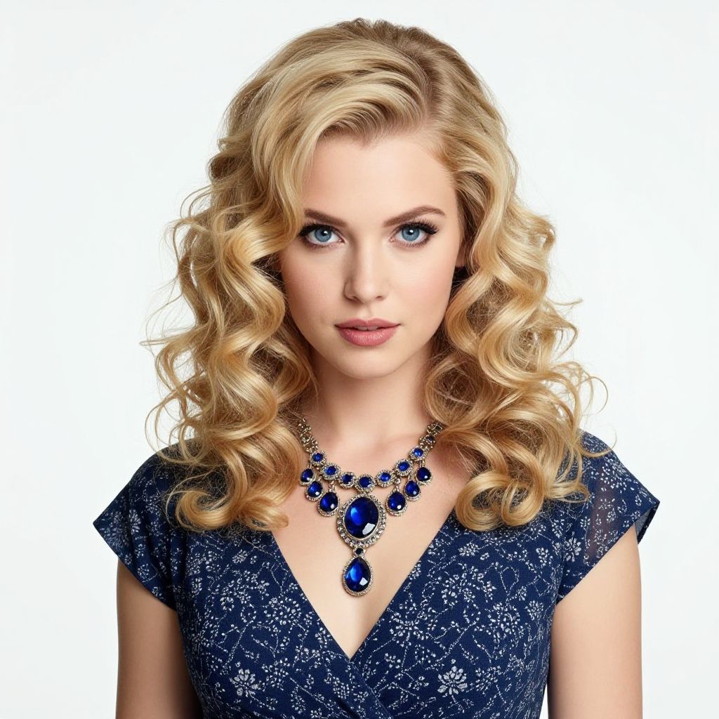 A striking portrait of a young woman with voluminous, perfectly styled blonde curly hair and captivating blue eyes. She wears a dark blue dress with a delicate white pattern, paired with an elegant statement necklace featuring large blue gemstones, set against a clean, light background.