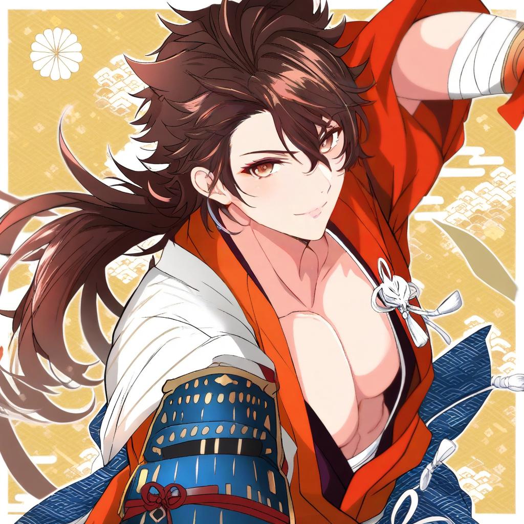 Mutsu-no-kami yoshiyuki, touken ranbu, 1boy, yellow eyes, brown hair, long hair, japanese clothes, japanese clothes, sode, by artist nitamako (sakamalh), animagine