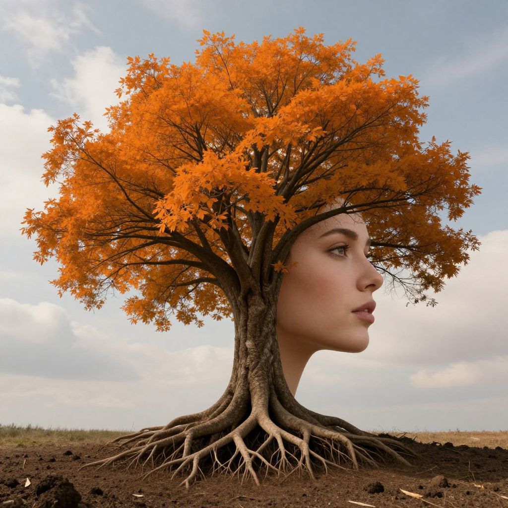 A surreal fusion of nature and humanity emerges as a woman's face seamlessly transitions into a sprawling tree, its roots embedded in earthy soil while vibrant orange leaves cascade above her head against a soft, cloud-dotted sky.