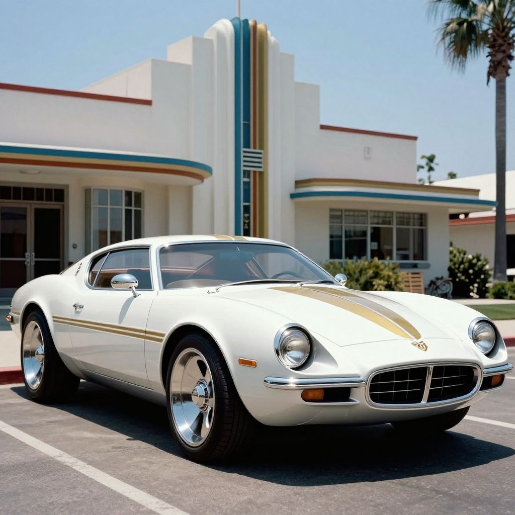 Guigario style, concept art, a futuristic avocado and steel car, pop up headlights and concave all steel wheels. white and gold stripes retrofuturism, 1973 california, in front of an art deco house, photorealistic, leica summilux, fuji velvia