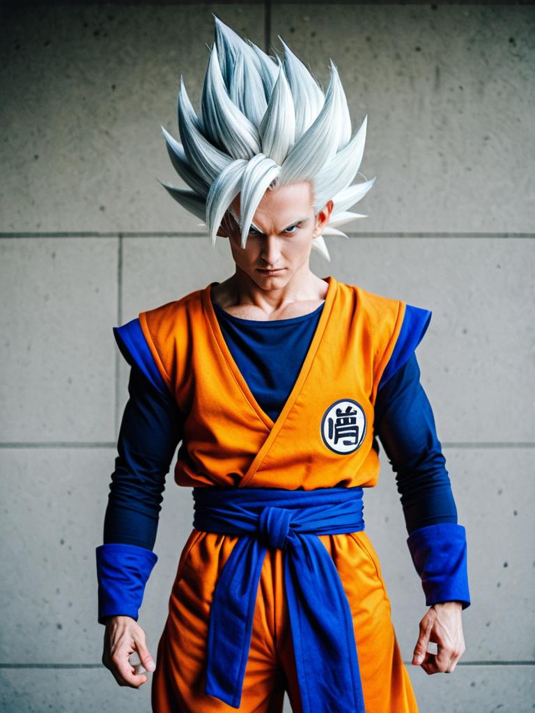 Man in Dragon Ball Super Saiyan costume, photorealistic cosplay photography