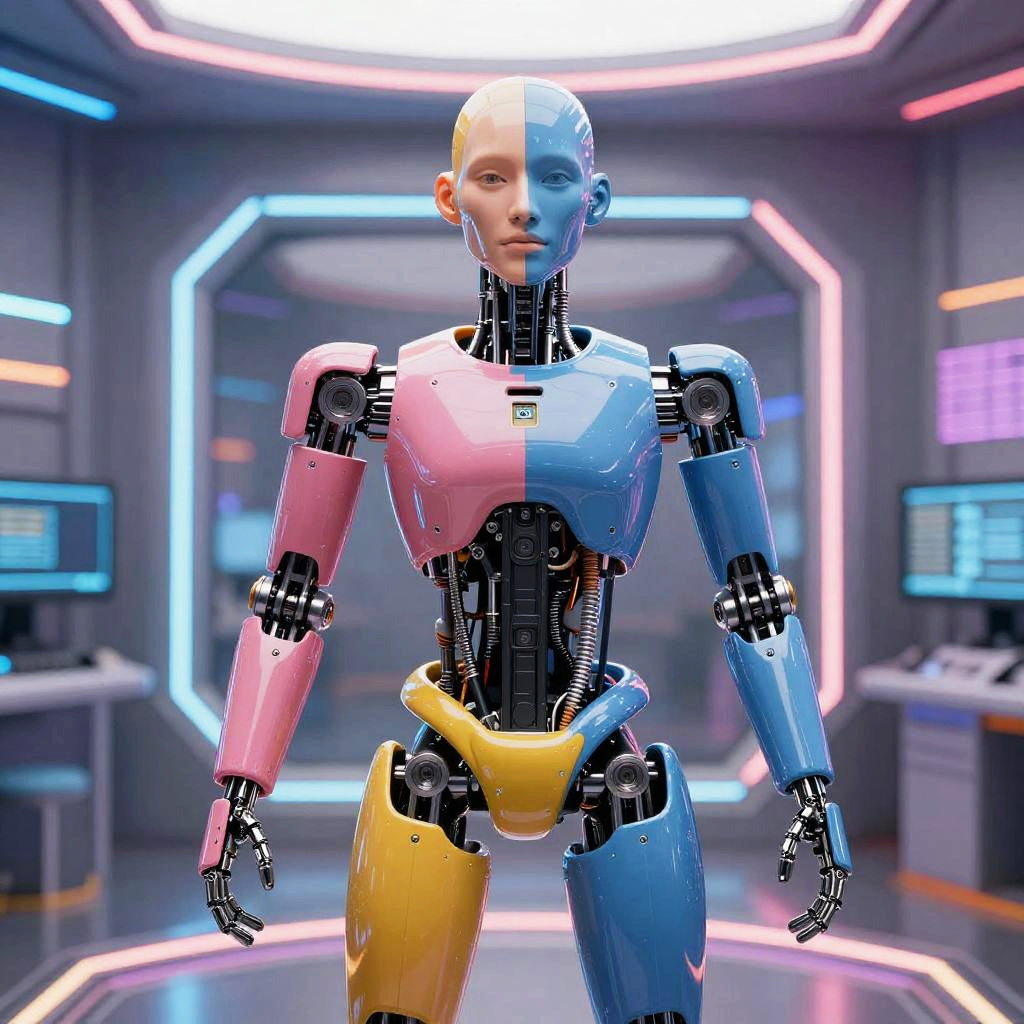 A robotic musician standing in a futuristic concert hall, art inspired by Elena Gordon, spotlight with neon hues.