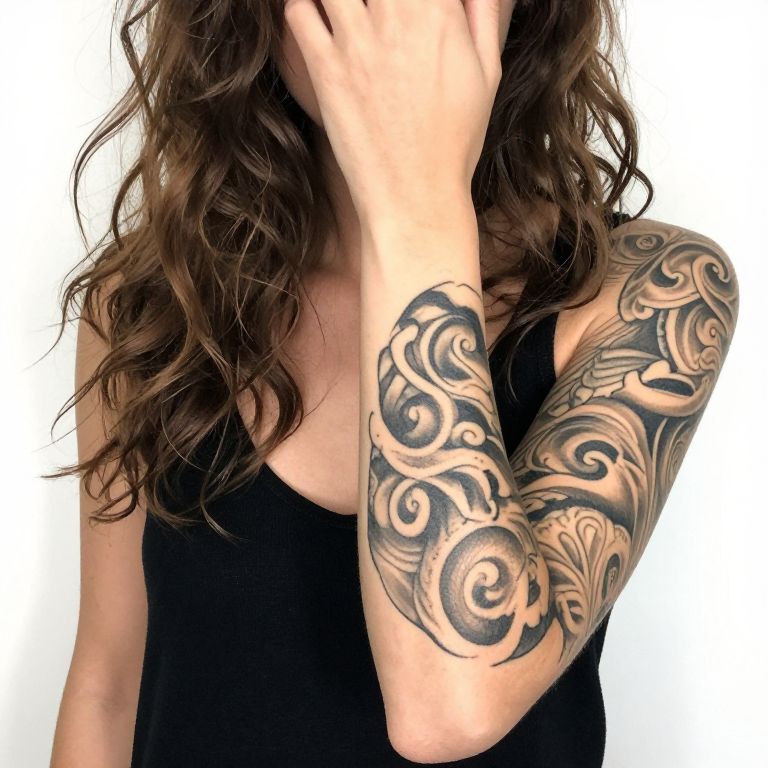 Photograph of a tattooed person with long, wavy brown hair, partially covering their face with their arm. They're wearing a black top with a deep neckline, revealing some skin. The background is bright white, making the person and their detailed arm tattoos stand out. The person's arm tattoos feature intricate, swirling patterns. The image has a slightly grainy texture.