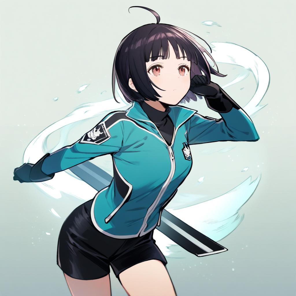 Amatori chika, world trigger, 1girl, purple eyes, short hair, black hair, ahoge, bob cut, mikumo squad's uniform, uniform, mikumo squad's uniform, black gloves, uniform, black shorts, blue jacket, long sleeves, by artist ge-b, animagine