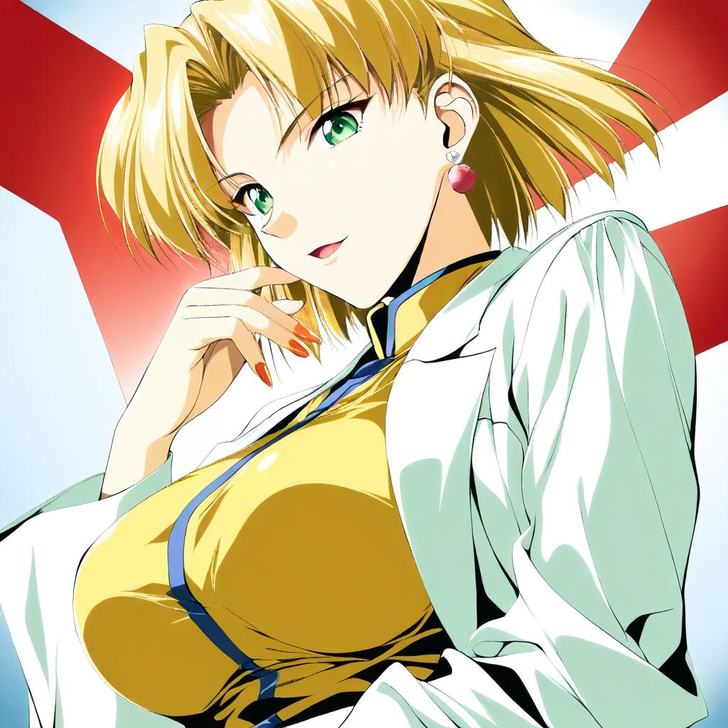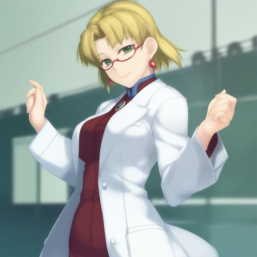 Akagi ritsuko, neon genesis evangelion, 1girl, green eyes, mole under eye, short hair, blonde hair, large breasts, medium breasts, lab coat, earrings, lipstick, by artist 40hara, leet
