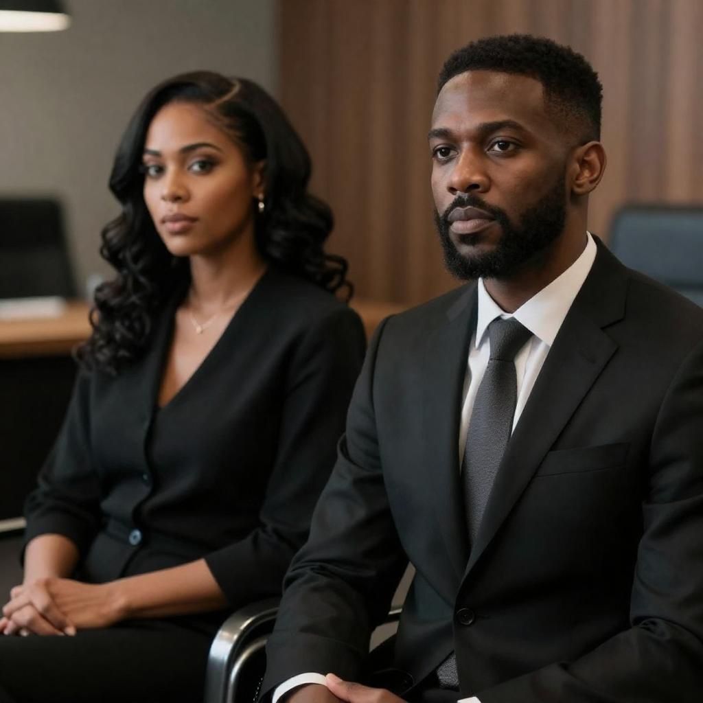 Photograph of a serious African-American man in a black suit and tie, with a trimmed beard, sitting next to an African-American woman with long, wavy black hair, wearing a black top. They are seated in a modern office with dark furniture and a wooden panel background. The man looks to the right, while the woman gazes forward.