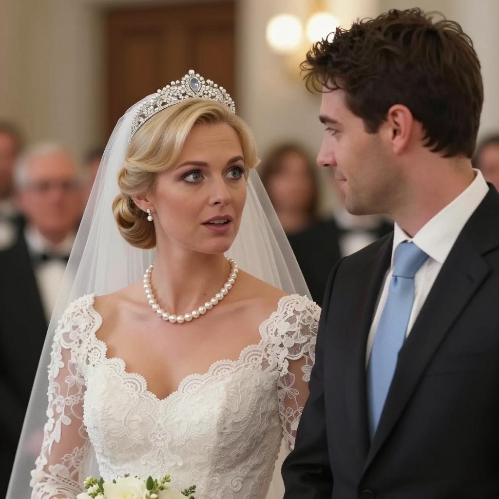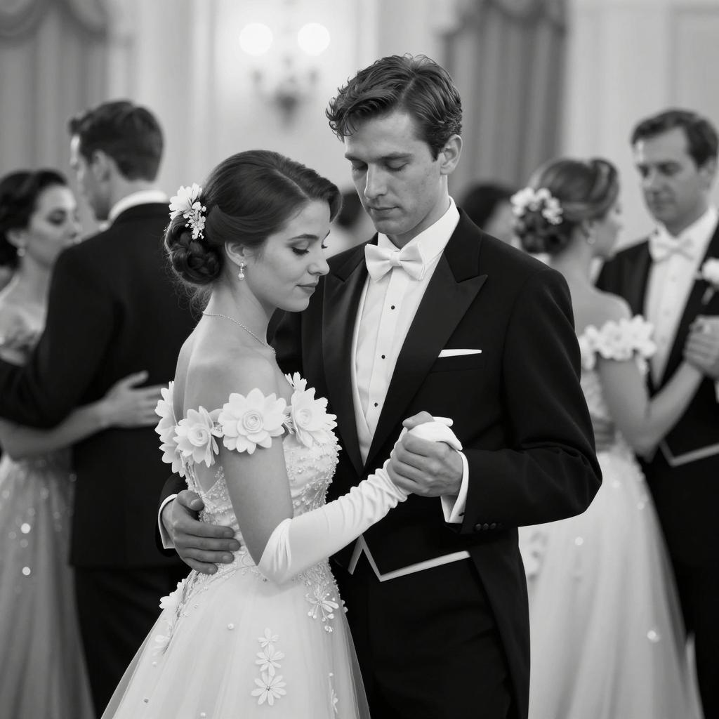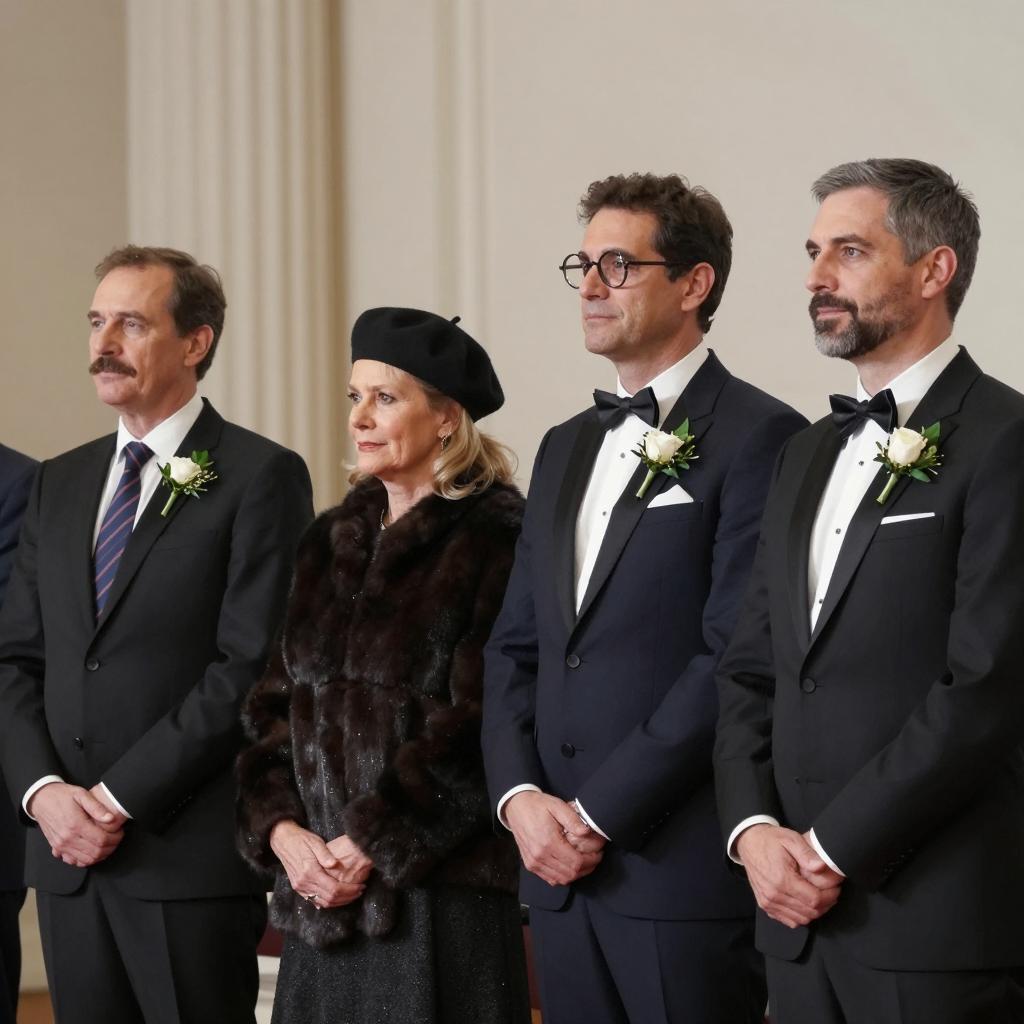 A formal party with 11 people. Central man in dark suit, blonde woman with curly hair in white dress, boy in plaid suit and bow tie, smiling woman in white lace dress in foreground. Blue dress woman facing away. Background: people dancing, green and teal clothing. Warm indoor lighting. Facial expressions: smiling, neutral, focused.