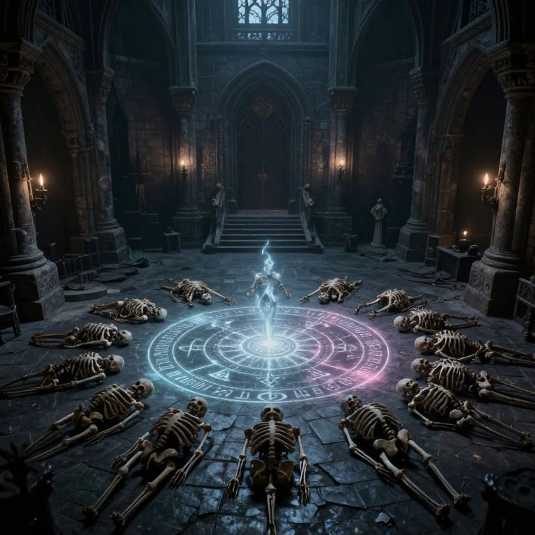 Yorick's necromantic ritual chamber inside an ancient ruined castle, arcane symbols glowing on stone floor, skeletal remains arranged in a circle, flickering ethereal lights casting ominous shadows, dark fantasy setting combining decay and dark magic ambiance.